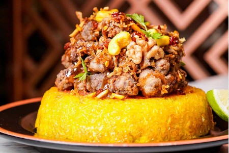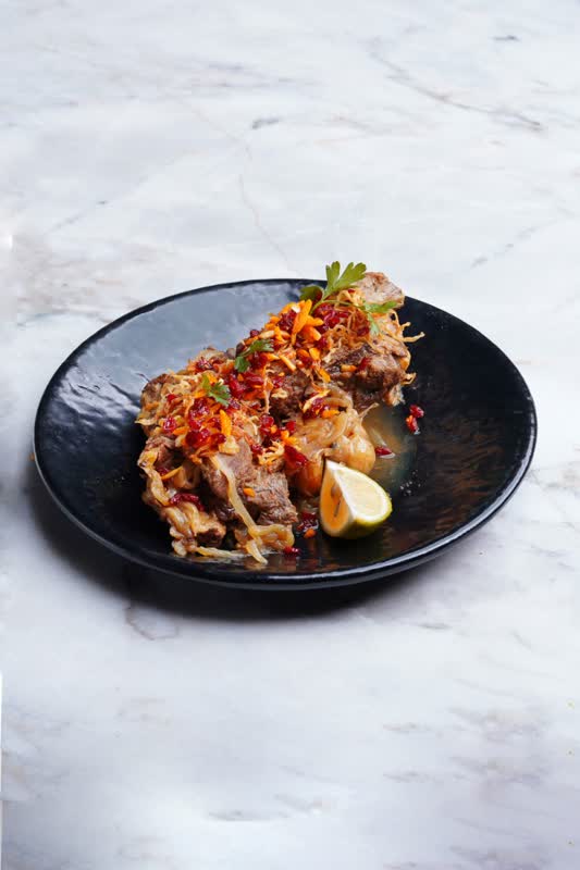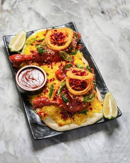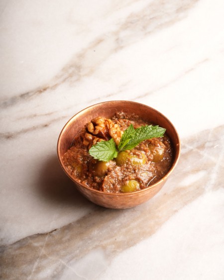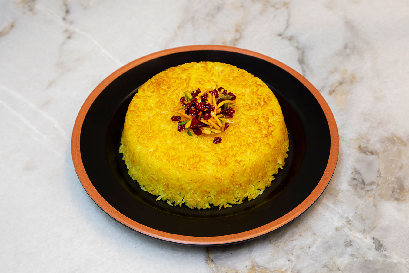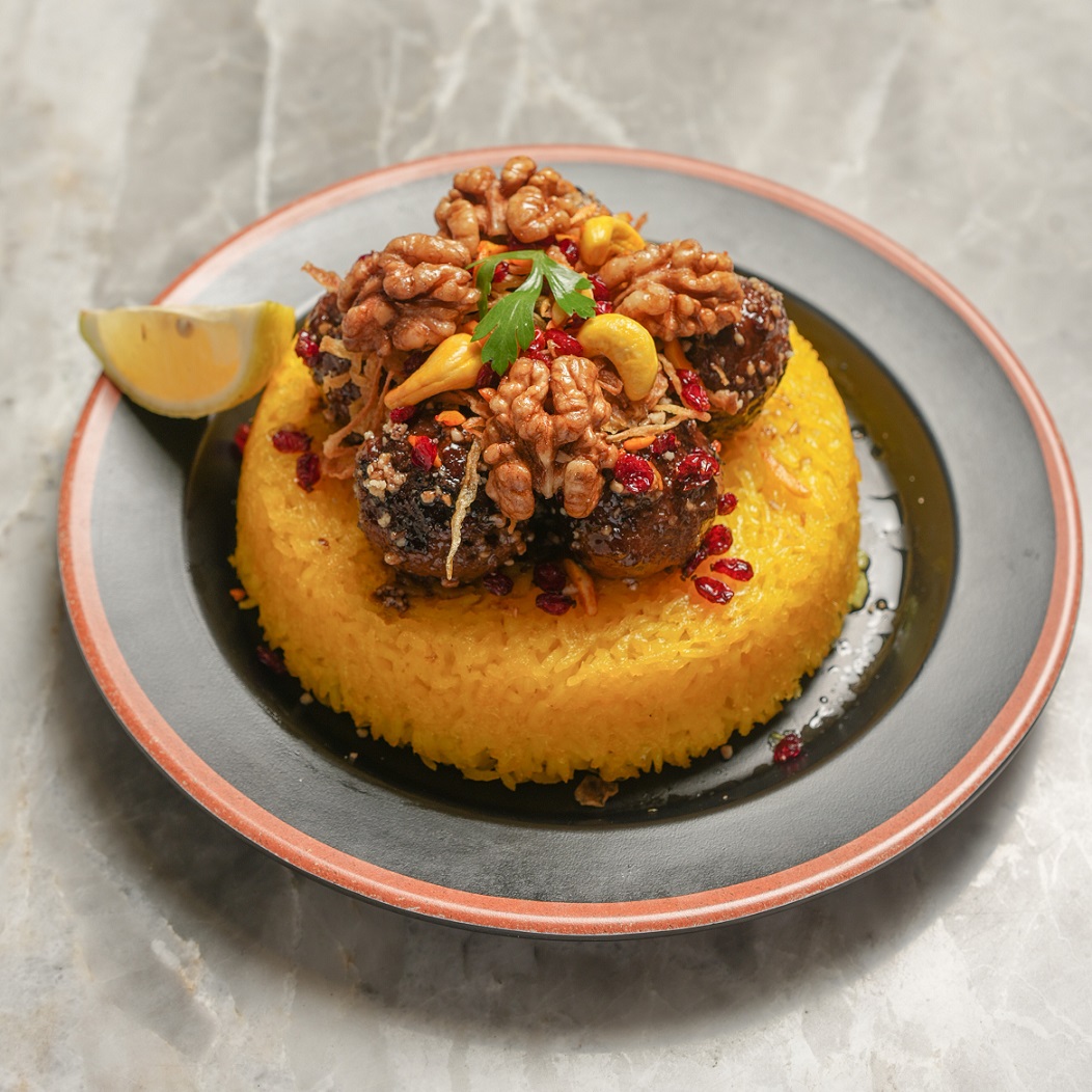 کته زعفرانی،220 گرم گوشت قلقلی به همراه گردو ساطوری،پیاز داغ،زرشک،خلال بادام،رب انار،آجیل بوداده