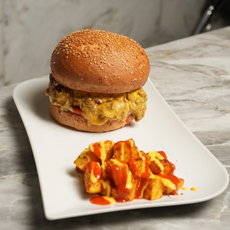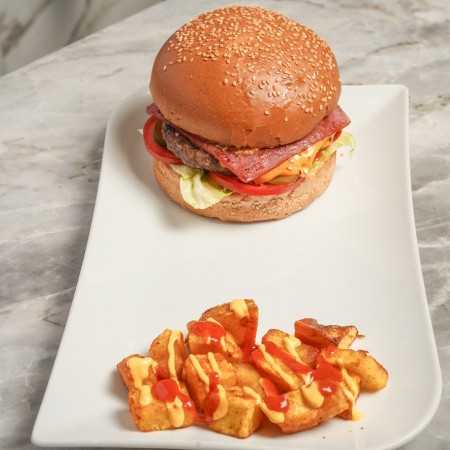 200گرم سینه مرغ مزه دار شده،سس بیگ بنگ ،سس تارتار،دیپ چدار،بیکن مرغ، کاهو،گوجه فرنگی، خیارشور،سیب زمینی