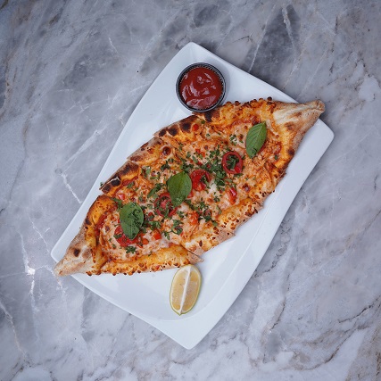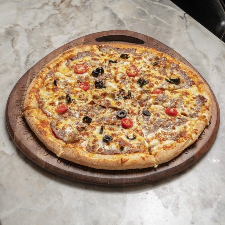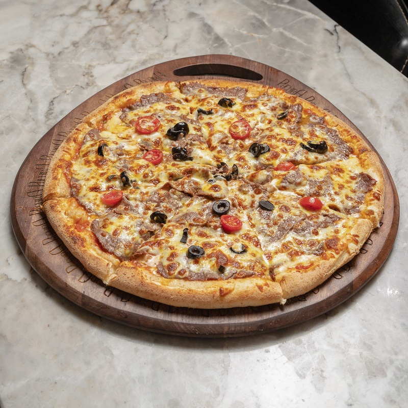 خمیر پیده،سس گوجه،گوشت رست بیف،گوجه اسلایس،پنیر مزه دار