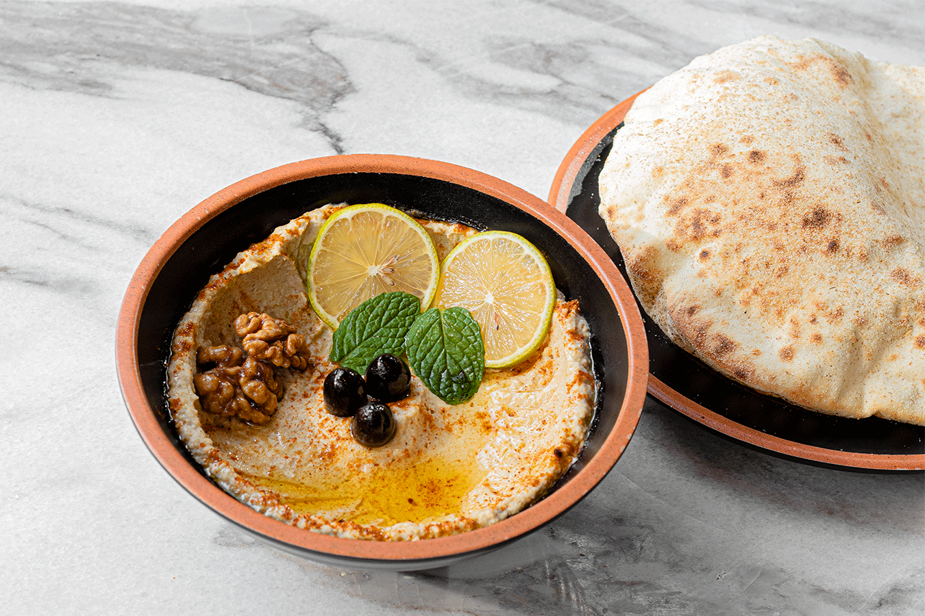 پوره نخود،ارده،روغن زیتون،لیمو،نان پیتا