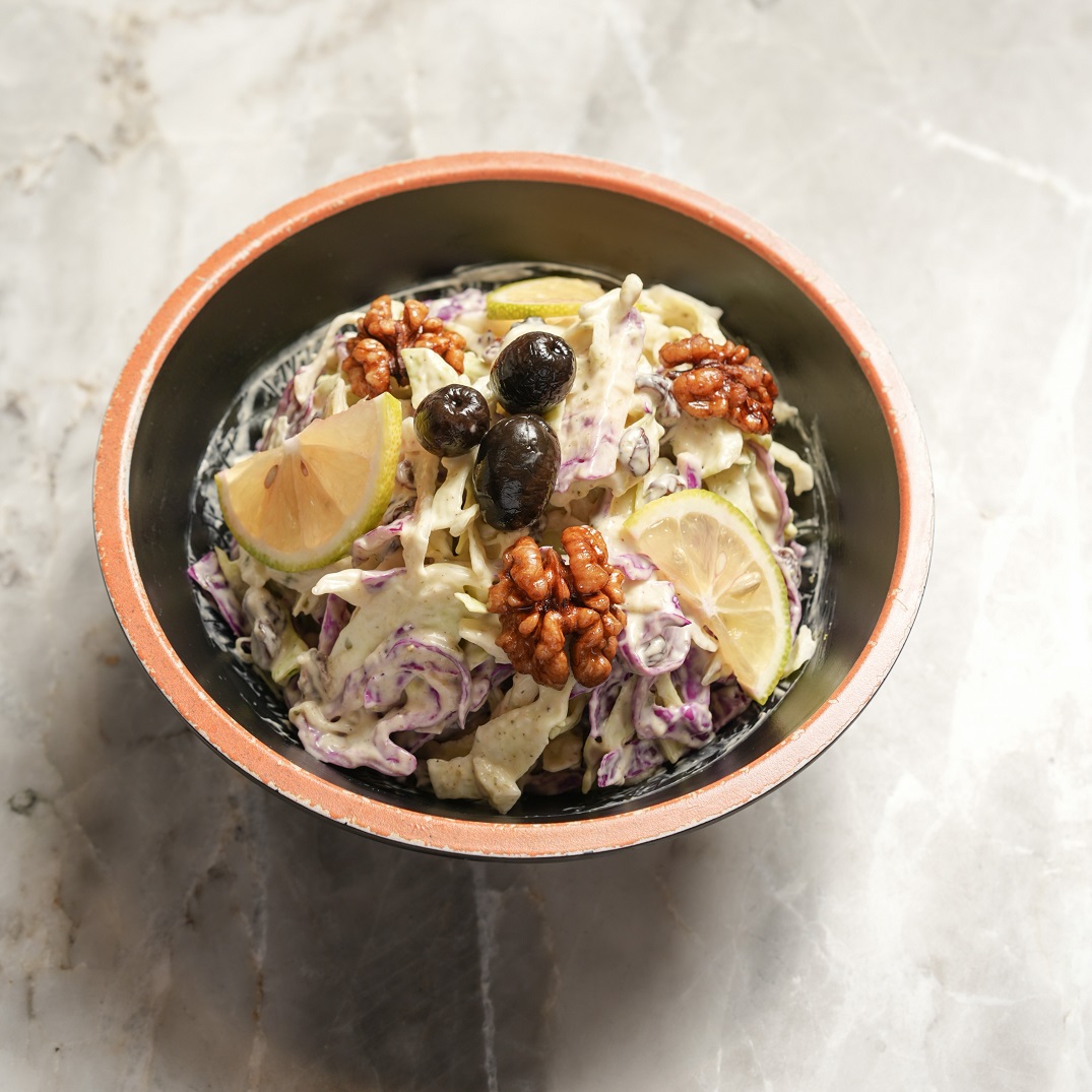 کلم قرمز .کلم سفید .زیتون .کشمش .گردو،سس تارتار