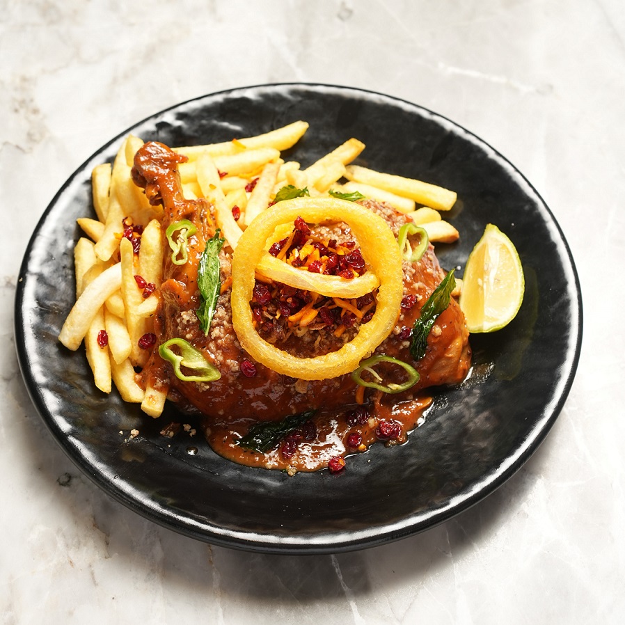 550 گرم ران مرغ، سس زرشک، به همراه سیب زمینی