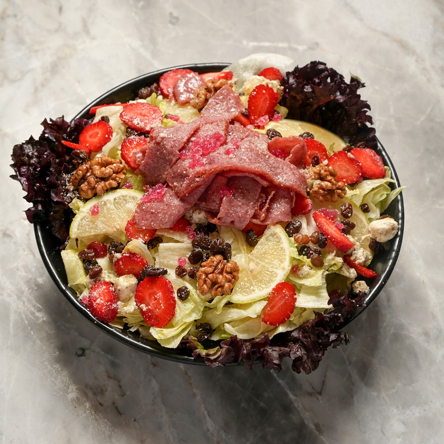 کاهو رسمی .کاهو فرانسوی.سینه مرغ مزه دار شده،لیمو .سیب درختی .مغز تخمه افتابگردان. گوجه چری .پنیر پارمزان.گردو کاراملی،سس بروسل