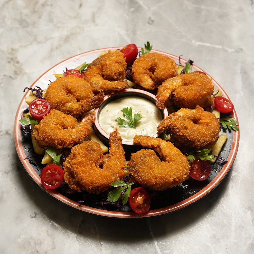 هشت تکه میگو مزه دار شده سوخاری،سس تارتار،دورچین